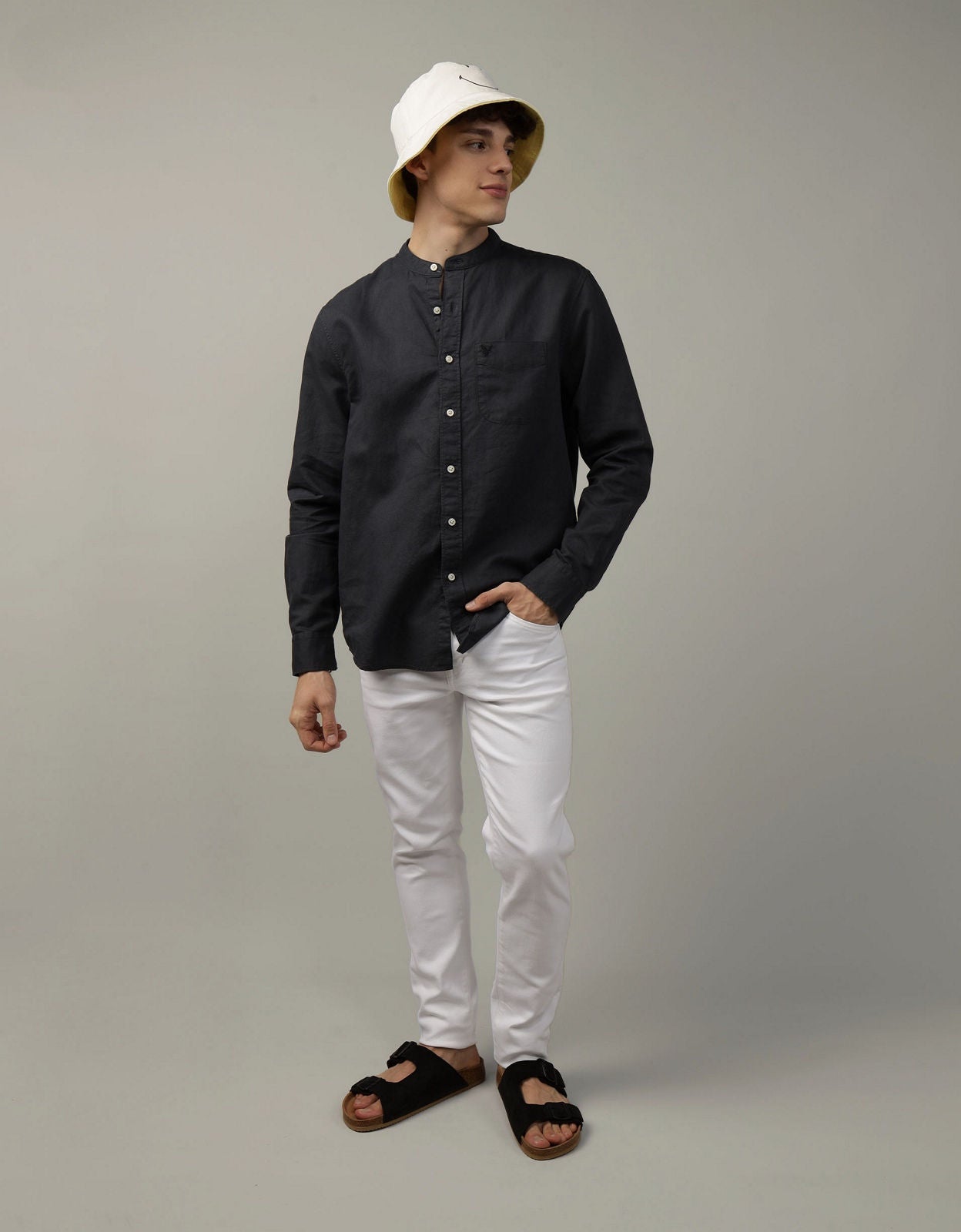 Made for warm weather, this stylish layer is made with a lightweight linen blend and features a casual band collar.