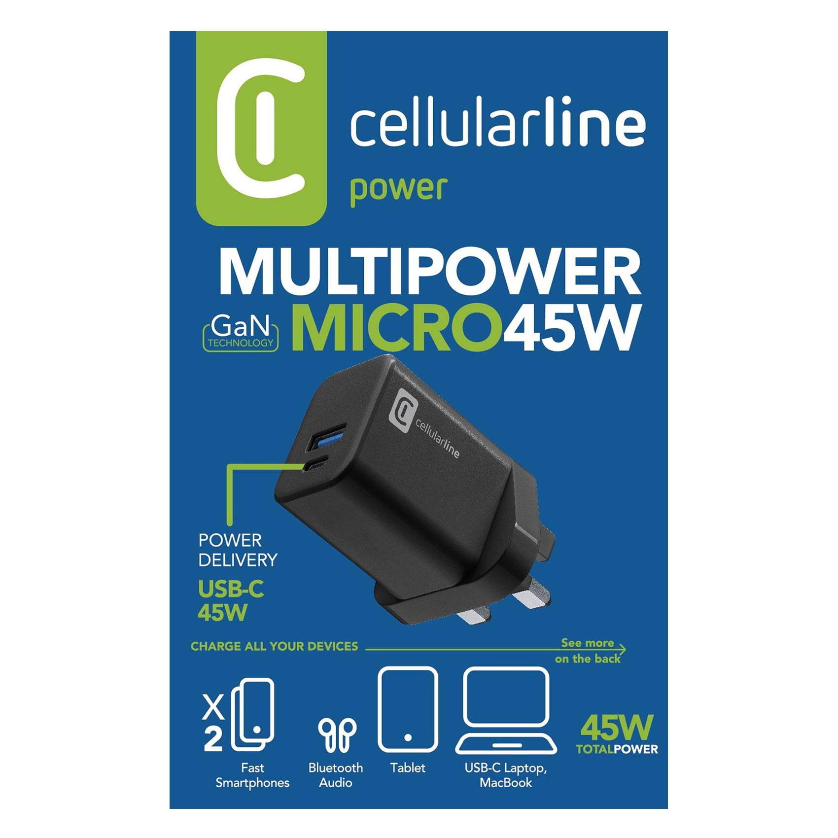 The Cellularline Power UK Plug GaN+ Multiport Charger 45W is a compact and efficient charging solution designed to meet the needs of modern devices. Utilizing advanced GaN+ (Gallium Nitride) technology, this charger offers high power output in a small form factor, making it ideal for home, office, or travel use.