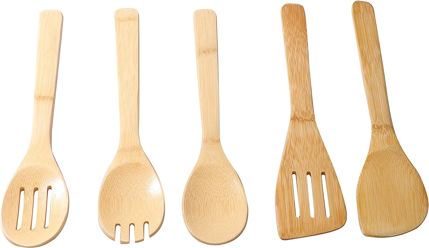 - Delcasa Bamboo 5pcs Kitchen Set makes cooking a breeze! Whether stirring, mixing, dividing, tasting, or turning foods, it tackles everyday cooking tasks, from food preparation to serving. These kitchen utensils whip up everything from a snack to an evening meal and holiday meals. They're lightweight, yet strong, and safe for use on nonstick cookware, making them the perfect cooking tools for everyone, even families with budding young chefs just learning to cook. Great for wok cooking, too! They store away easily in a kitchen gadget drawer and look great in a utensil holder on the counter, always at the ready. Made from 100-percent natural bamboo, Delcasa spoon is lightweight, strong, and less absorbent than wood. They are safe for use on nonstick cookware and metal pots and pans. Bamboo is a fast-growing, fully sustainable alternative to traditional materials for more sustainable living practices. Hand wash only. Occasionally coat with mineral oil to keep bamboo looking its bestFrom mixing a stew to flipping a fried egg, our bamboo utensils are must have additions to any kitchen.Made from top-graded bamboo, which is stylish, built to last and easy to grip. Bamboo wood is also naturally antibacterial. It does not absorb liquids easily and won't soak in food odours or stains.Safe to use on all non-stick cookware.