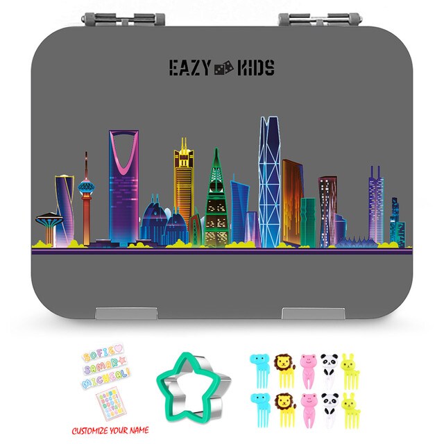 Eazy Kids 4 Compartment Bento Lunch Box w/ Sandwich Cutter Set-Love Saudi Grey
