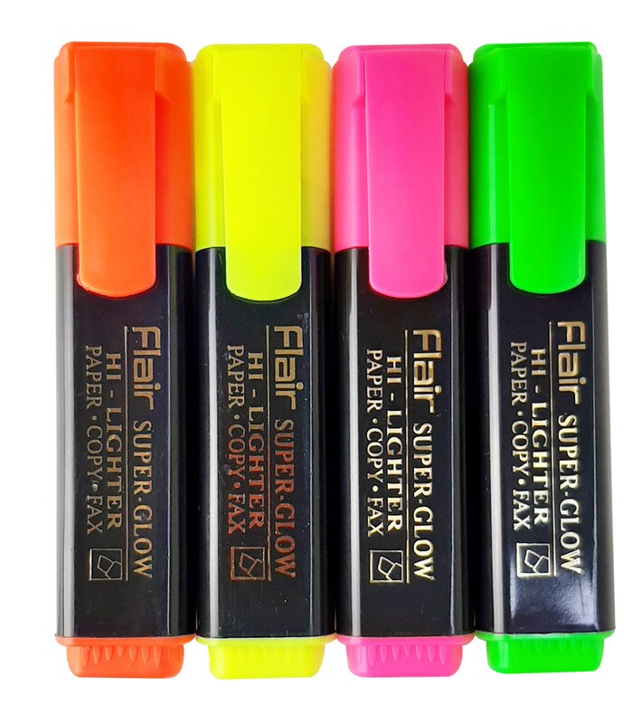 Flair Super Glow Mixed Hi-Lighter set of 4 piece Yellow, Pink, Green, Orange