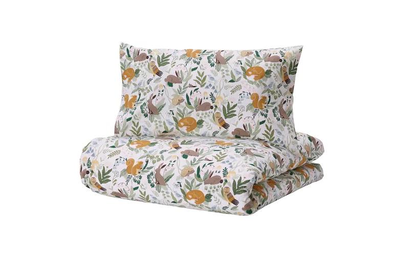 Comprises: 1 quilt cover (110x125 cm), 1 pillow case (35x55 cm) and 1 fitted sheet (60x120 cm).