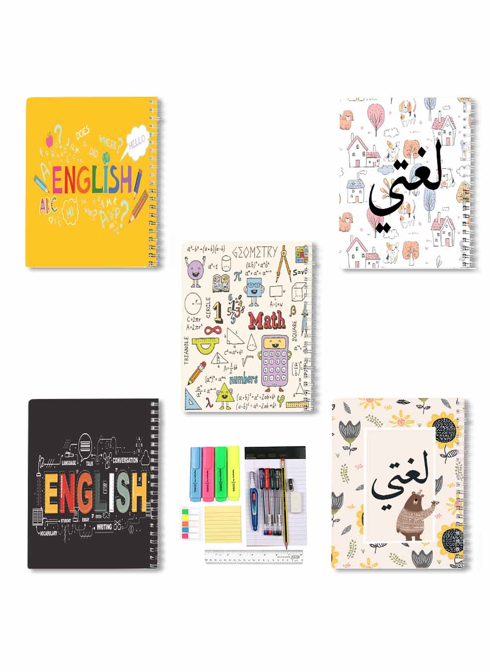 Lowha Set Of 5 Spiral Notebooks For School, 60 Sheets With Hard Paper Covers For Arabic, English, Math With A Set Of School Supplies
