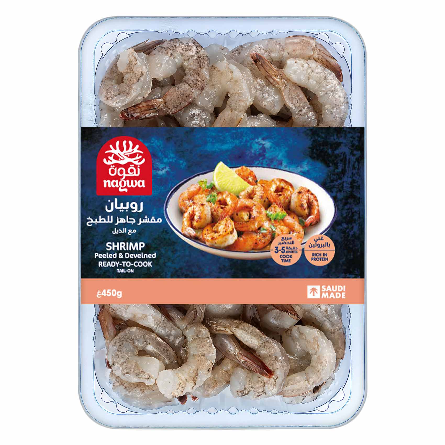 NAGWA Shrimp Peeled & Deveined Ready-to-Cook Tail-On 450g Rich in Protein 3-5 Min Cook Time, Saudi Made