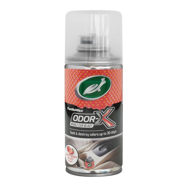 Description: The Turtle Wax Odor-X Whole Car Blast is an innovative solution designed to tackle unpleasant odors in vehicles. It offers a no-residue formula that can safely permeate every part of your car, ensuring that odors are not just masked, but eliminated. This product comes in a handy 100ml can, which makes it easy to store in your vehicle whenever you need a freshness boost. The scent adds a sweet and enjoyable fragrance that lasts up to 30 days, making your driving experience more pleasant. Usage is a breeze: just turn on the air conditioning, place the can in a holder, and let it distribute the scent evenly. With the Whole Car Blast from Turtle Wax, you can maintain a fresh, clean-smelling car with minimal effort.
