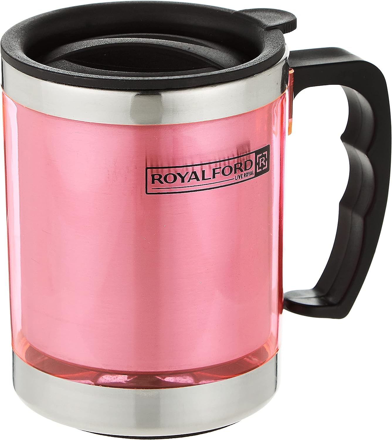 - 1. STAINLESS STEEL INNER WALL - This Royalford Travel mug is made up of durable material that is a safe durable body. No plastic taste and mental taste. An elegant gift for man and colleague. Give you a healthy life.2. LEAKPROOF TRAVEL-MUG - This insulated mug can keep warm for long hours, nice for backpack and bag with a leak-proof lid. No leaking while you upside down the mug. Ideal with coffee, milk, juice and so on. No filter comes with the bottle.3. DURABLE AND COMFORTABLE HANDLE - Wide handle gap depends on the hand of a variety of people. Let you carry a water mug easily and more comfortably. The stable handle can enhance the service life of this mug.4. SMOOTH SURFACE FOR WASH - Smooth plastic outer and ceramic inner, create an easy wash surface. Using clear water also nice for cleaning the mug body.5. LARGE CAPACITY - 290ml capacity with beautiful shape, bring a good sense of use for you, you can enjoy your coffee, tea, wine, juice quite nicely. Suitable for use indoor & outdoor, like home, parties, travel, and office time.