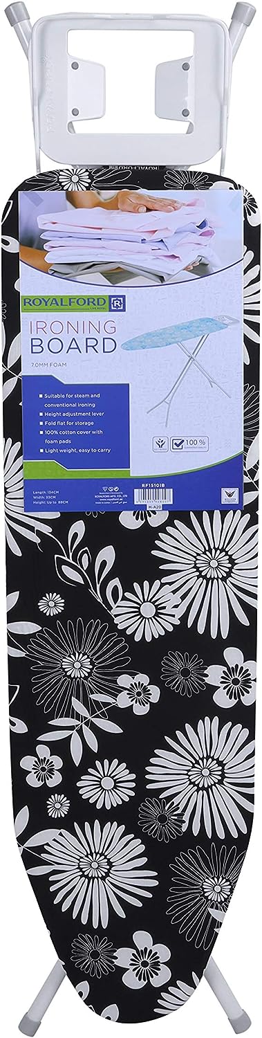 - SUITABLE FOR ALL USERS - This large ironing board is ideal for your everyday task of ironing full loads of laundry. It features adjustable working heights to accommodate the user's height and preference. Suitable for both left and right-handed use, this ironing board boasts of a metal iron rest that is provided at the head of the ironing table.SAFE AND DEPENDABLE - Equipped with several locks underneath, the iron table prevents accidental collapse and is, therefore, safe to use even around a busy household. Durable non-slip caps at the ends of the rod's legs help prevent damage to flooring and from toppling over due to brusque movements. The extra stable four-leg design keeps the board sturdy while in use, creating an even and rigid ironing surface.EASY STORAGE - While the transport lock keeps it securely folded for storage, rubber ends at the legs of the iron stand prevent slippage and damage to your flooring. Setting up takes less than five seconds, and it is just as easy to compactly fold after use. Simply store in a corner of your clothing cabinet or at any available space in an upright manner.STYLISH AND ATTRACTIVE DESIGN - The Royalford Ironing Board with Steam Iron Rest keeps your iron safe and sturdy at a place without any fear of burning your clothes or cover. Whether it is attractive pattern or simple solids, the designs available are sure to improve the look of your living space!.