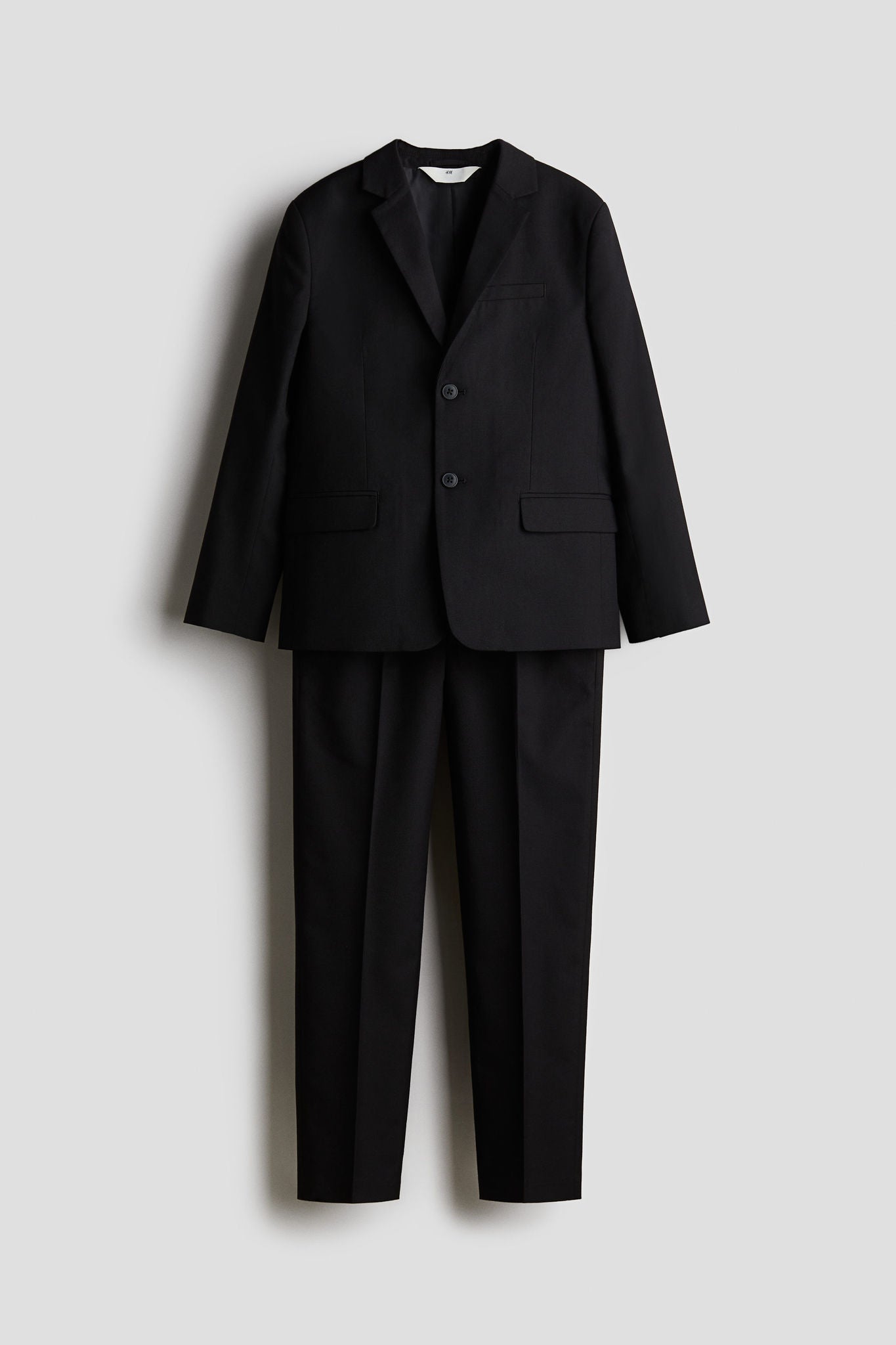 Suit with a classic jacket and matching trousers in woven fabric. Two-button jacket with notch lapels, a fake chest pocket and flap front pockets. Decorative buttons at the cuffs and a single back vent. Lined. Trousers with an adjustable, elasticated waist, concealed hook-and-eye fastener and zip fly. Side pockets, welt back pockets and tapered legs with creases.