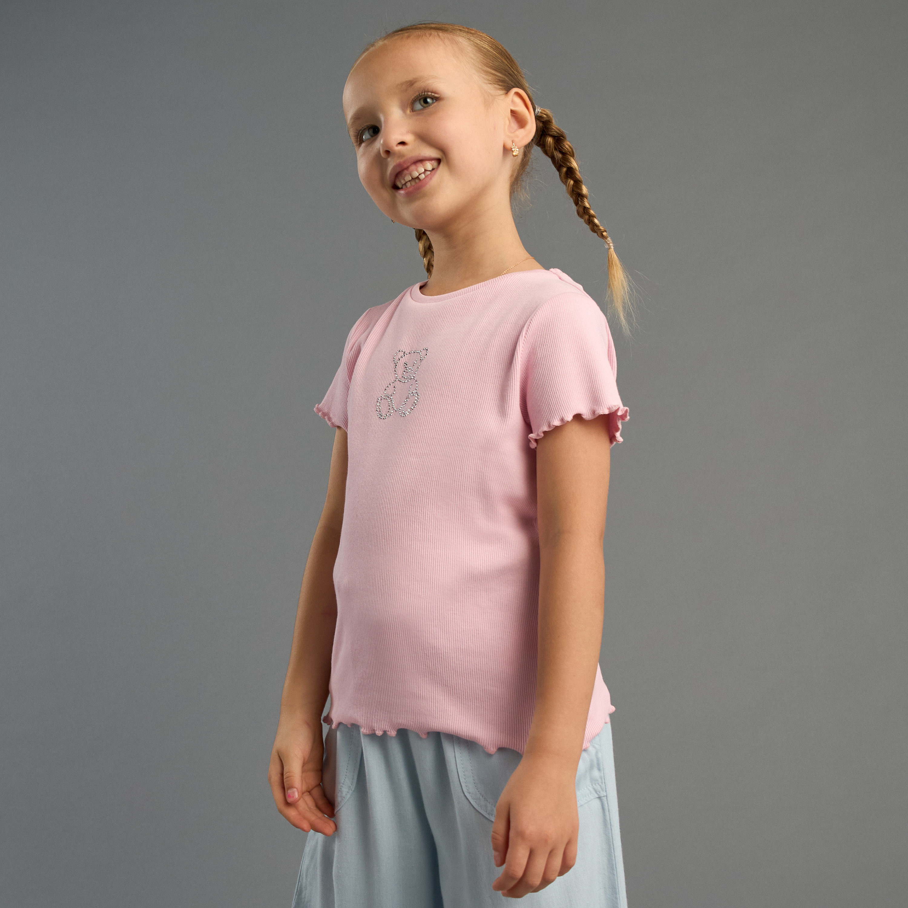 This adorable short-sleeved T-shirt features a charming diamante teddy bear design, perfect for little girls. Made from soft and breathable cotton, it ensures utmost comfort during their playful adventures.