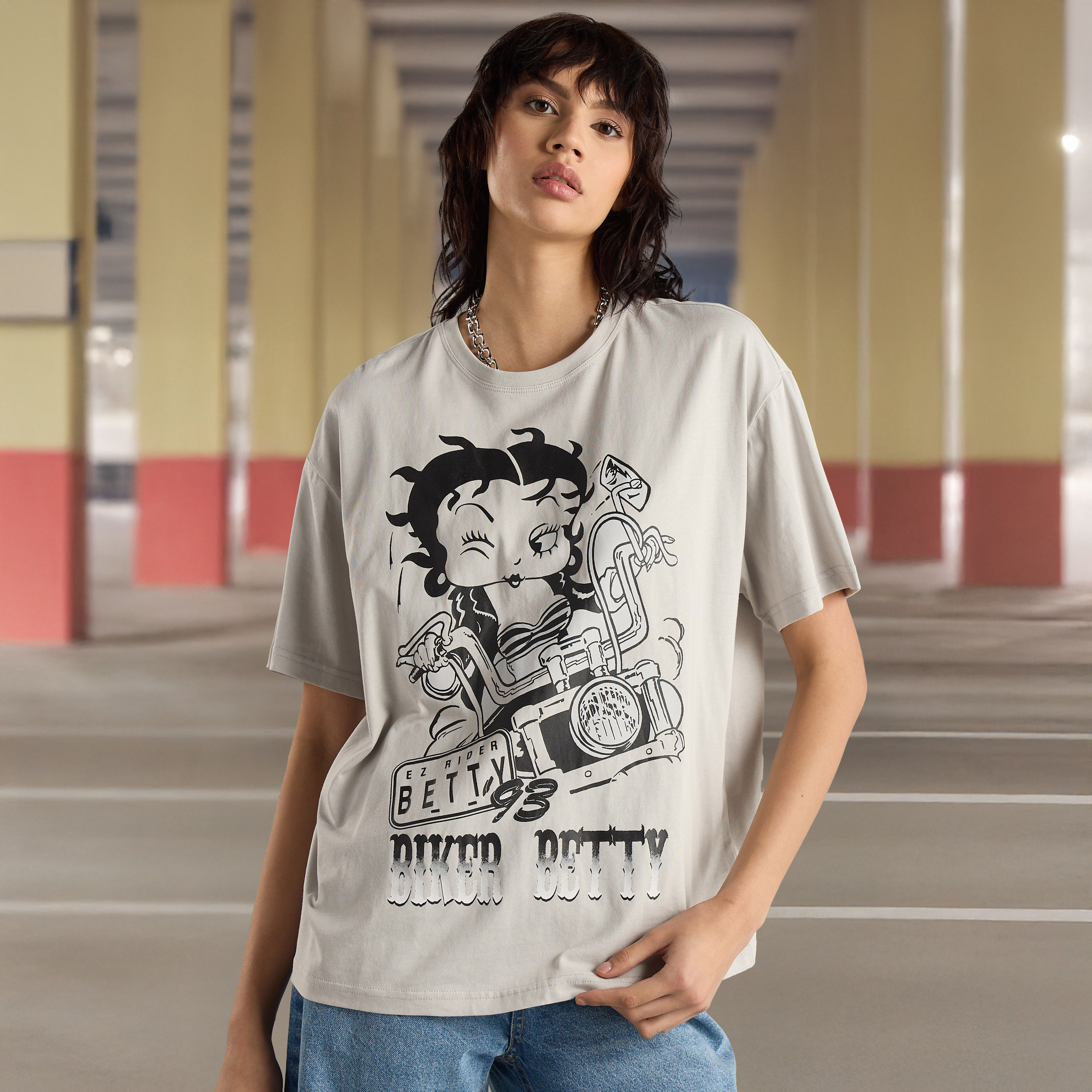 Add a playful touch to your wardrobe with this Betty Boop print T-shirt. Crafted from soft cotton, it offers comfort and style for casual outings. The fun graphic adds a unique flair, perfect for expressing your personality. Pair it with jeans for a relaxed, trendy look.