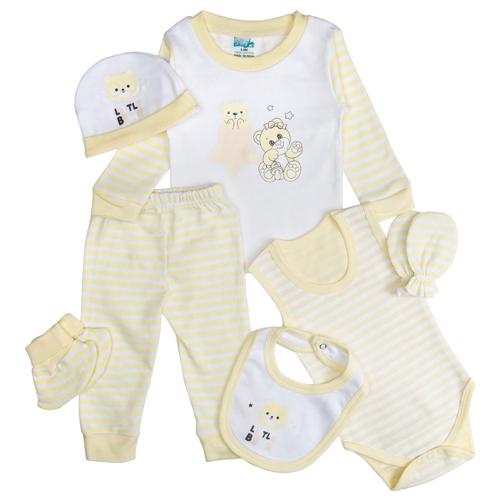 Babies Basic - 7pc Cotton Set - Bib, Romper, Mittens, Socks, Cap, Top & Pyjama - Yellow