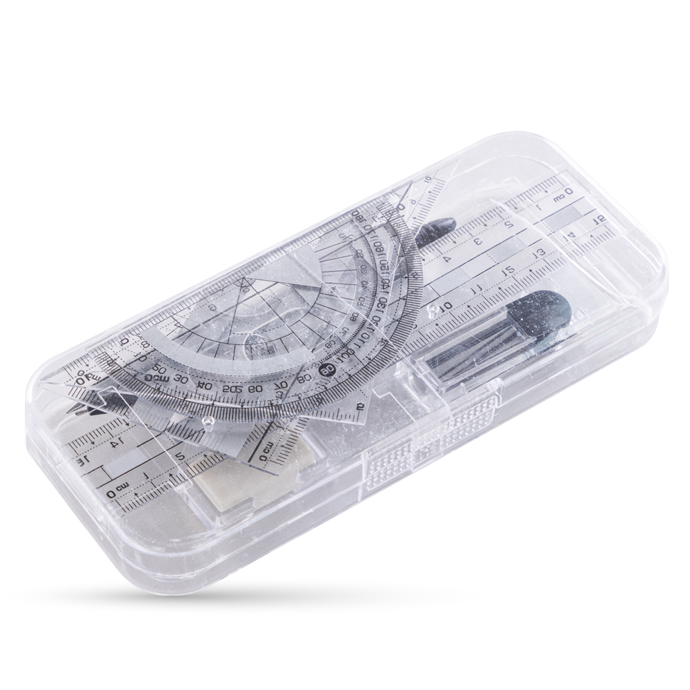 - Includes ruler, protractor, 2 set squares, compass, pencil, eraser, sharpener