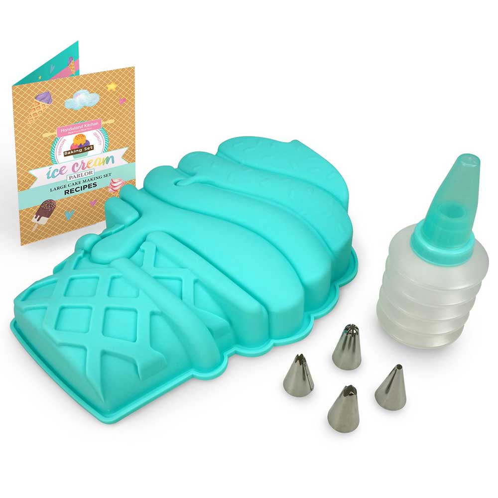 div:first-child]:line-clamp-4">Bake up some frosty fun with this incredible edible ice cream cone cake set! Get creative when you bake this cool cake that's fun to decorate and fun to eat! The 7 piece baking set for real kitchen use includes: 1 large ice cream cone-shaped silicone cake mold, 1 frosting bottle with 4 tips and recipe leaflet. Recipes include: Ice Cream Cake, Royal Icing and Ice Cream Frosting.