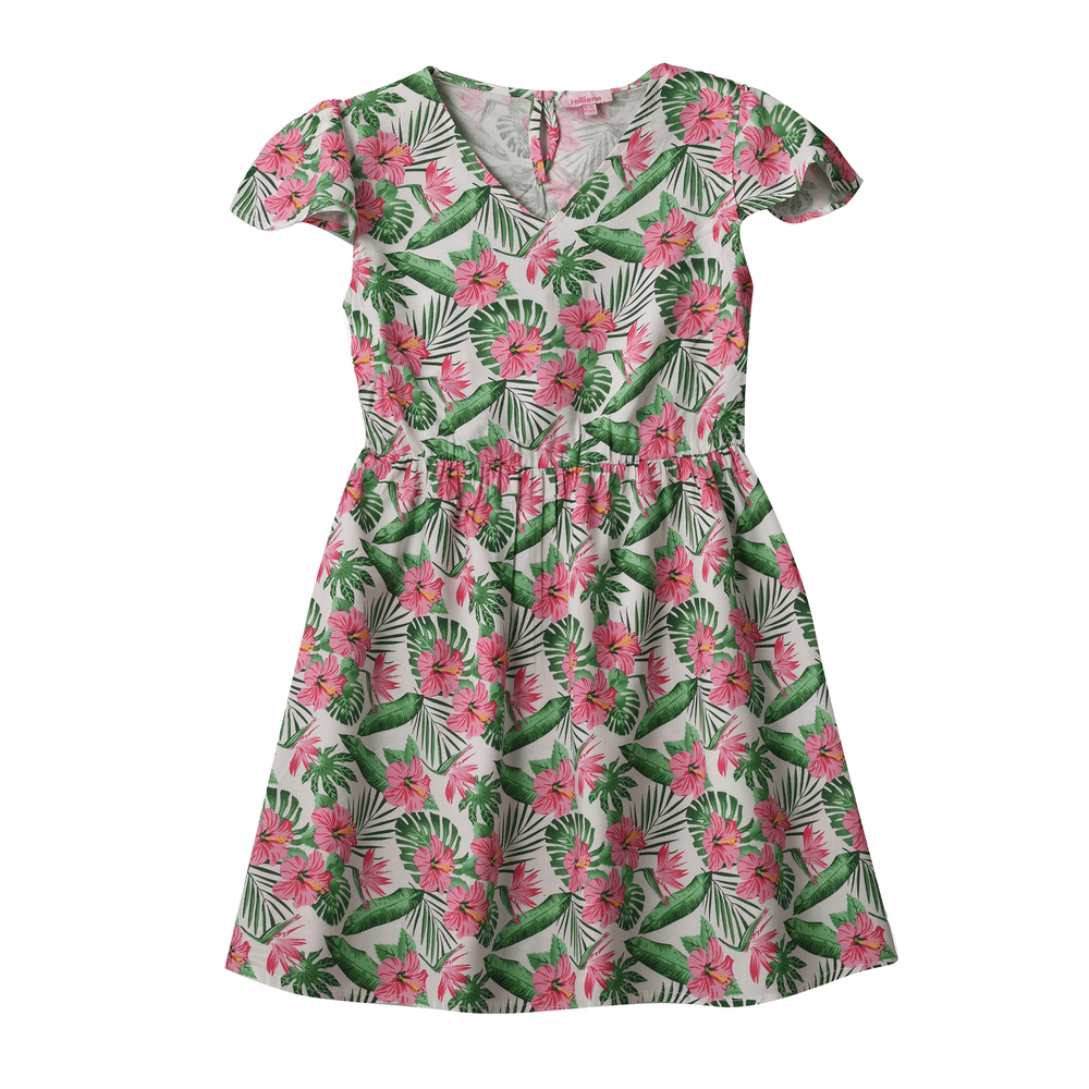 div:first-child]:line-clamp-4">Girls' tropical floral printed dress featuring pink hibiscus-style flowers and lush green leaves on a white woven viscose base. This fit & flare silhouette has flutter sleeves, a V-neckline, and an elastic waist. Perfect for summer days and vacations.