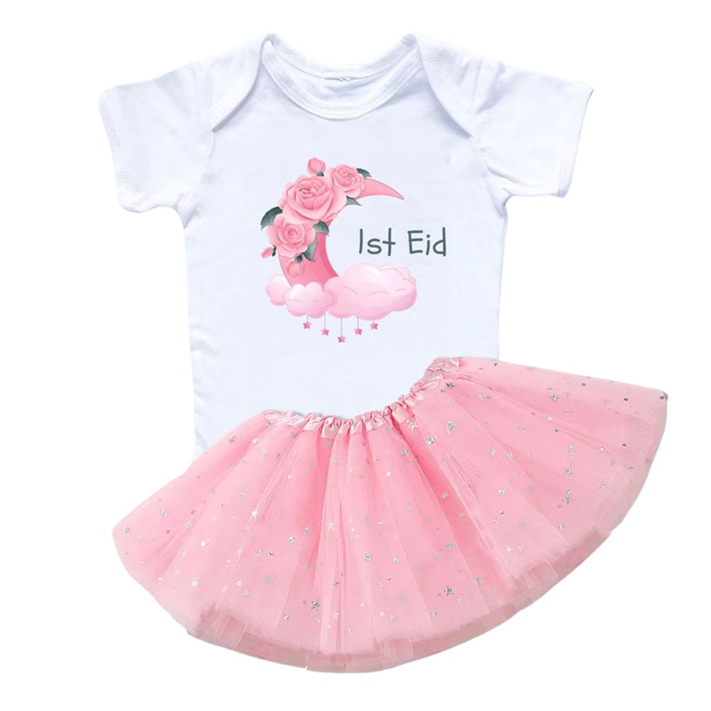 Matching Family Outfits - 1st Eid Baby Romper And Skirt Set - White And Pink