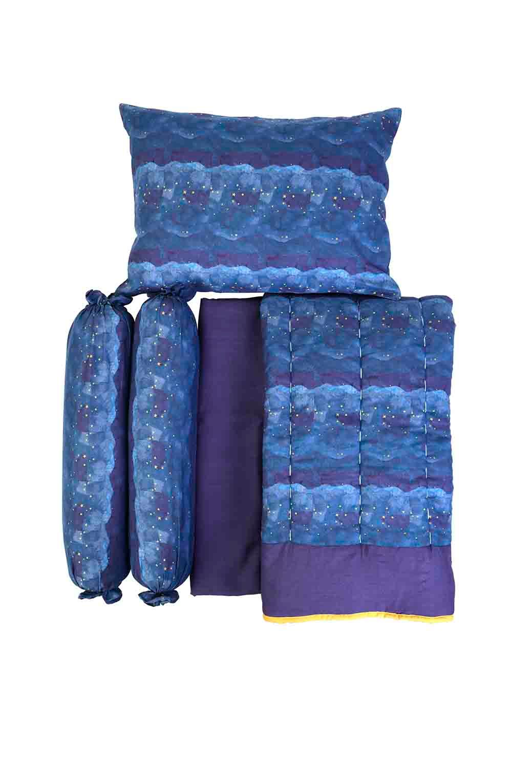 5pc luxury set includes flat crib sheet in standard cot size, snuggly hand quilted custom printed duvet, matching pillow and 2 bolsters