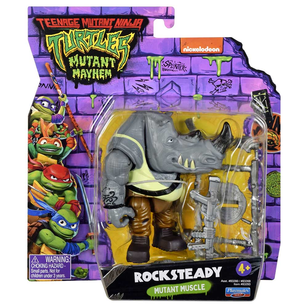div:first-child]:line-clamp-4">Get ready for the Mutant Mayhem figures and accessories, based on the new CG animated Teenage Mutant Ninja Turtles movie! Built like a tank, Rocksteady is pure rhino mutant muscle. Whether it's from his fists or his horn, you do not want to take a hit from this guy! , , When Super Fly plots to destroy the Turtles and wreak mutant mayhem, Rocksteady and his dangerous-yet-dim partner in crime, Bebop, are ready and willing to charge in and join the fight! Rocksteady figure is 4" tall and designed to match his movie character. Set includes his iconic blaster and a weapons rack, and comes in a unique Mutant Mayhem package!