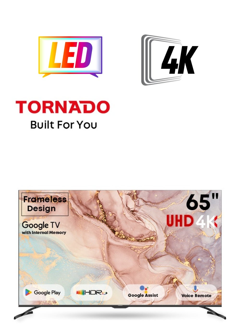 TORNADO 4K Smart Frameless TV Screen size : 65 inch Resolution : 3840 x 2160 ( 4K , Ultra HD ) Aspect ratio : 16:09 Viewing angle : 178° Total internal memory : 16 GB Visual :- Visual technology : Dolby vision HDR10 HLG ( Hybrid log gamma ) Upscaling ultra HD Wide color gamut Color temperature : 3 Modes ( Normal - Cool - Warm ) Broadcasting type : Digital ( DVB-T/T2/S/S2 ) Picture modes : Dynamic - Game - Sports - Cinema - Natural Gaming :- Game mode VRR : 60 Hz Refresh rate : 50/60 Hz Audio :- Sound technology : Dolby Digital plus DTS studio sound Speaker type : Box speaker Audio output power : 12 Watt x 2 Sound modes : Vivd - Standard - Sports - Movie - User - Energy saving Smart Features :- Operating system : Google TV With built-in receiver Netflix application Shahid VIP Communication with youTube Prime video application Watch It Google play store Google assistant Chromecast built-in Bluetooth remote control Voice search Bluetooth Connect with wifi Time shift feature EPG schedule recording playback format sleep timer Multilingual OSD Favorite channel list Channel editor Child lock USB : Video - Photos - Music Inputs and outputs :- Rf In : 1 ( Digital ) Video In : 1 HDMI : 1 (ARC) HDMI (2.1) : 3 USB : 2 Power :- Automatic voltage regulator : AC 100-240 volt / 50 hz Power consumption : 200 watt Standby : 0.5 watt Energy efficiency class : ( F ) Dimensions ( Width x Height x Depth ) mm :- Without base : 1447.7 x 836 x 81.3 With base : 1447.7 x 898 x 265 Weight :- Net weight : 17.9 kg Gross weight : 24.5 kg