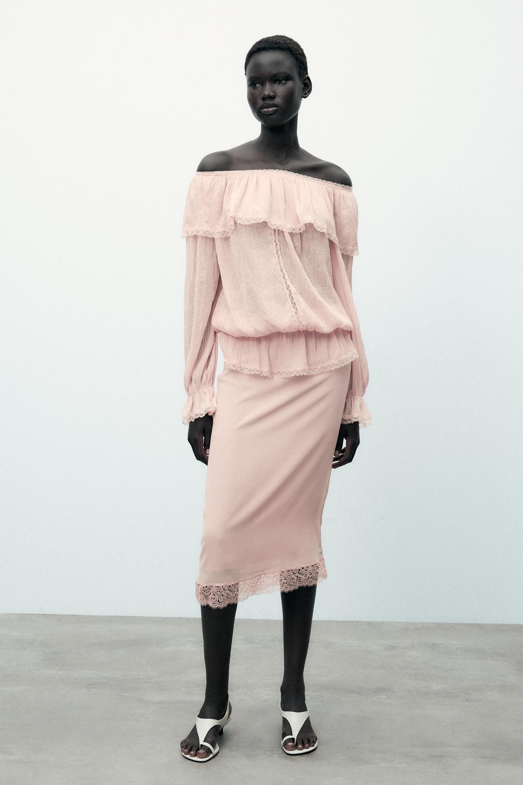 Semi-sheer shirt with a straight neckline and bib-style collar. Cold-shoulder design and long sleeves with elasticated cuffs. Elasticated shirred waist. Finished with tonal lace trim.